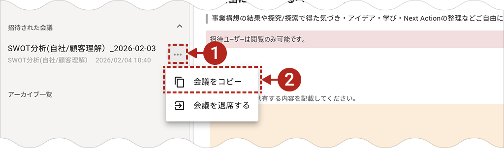 作成済みの会議をコピーして、新しい会議として複製することができます。 これまでに入力した情報やAIの生成結果を引き継いだ状態で、別のパターンを試したい場合などに便利です。