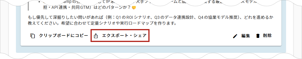 AIアシスタントが生成した結果ブロックの下部にある「エクスポート・シェア」リンクをクリックします。