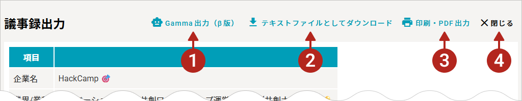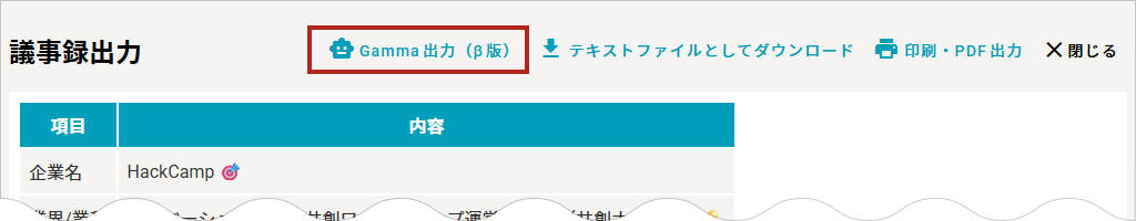 共創ナビivanの議事録出力画面から「Gamma出力」リンクをクリックします。