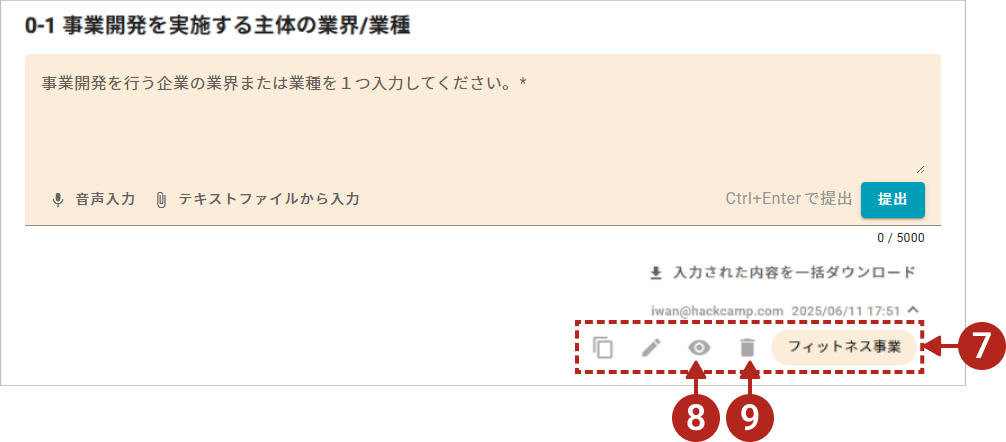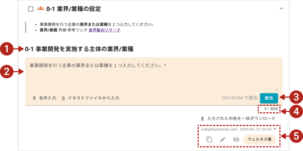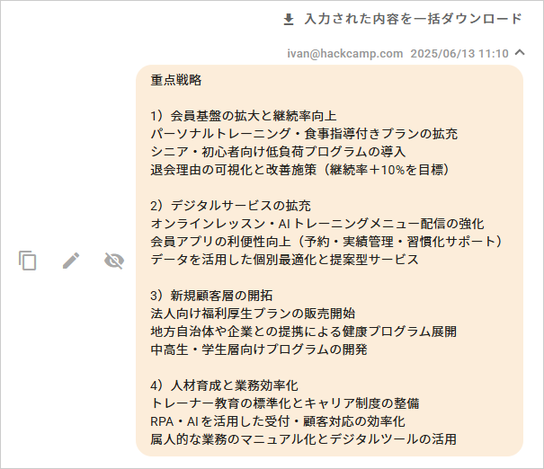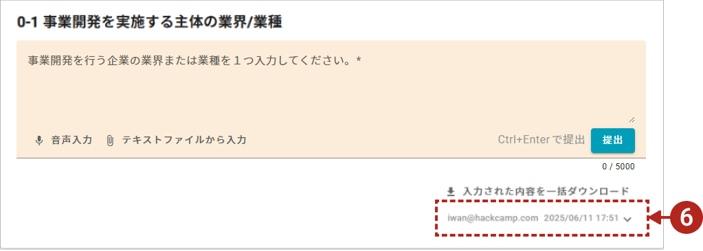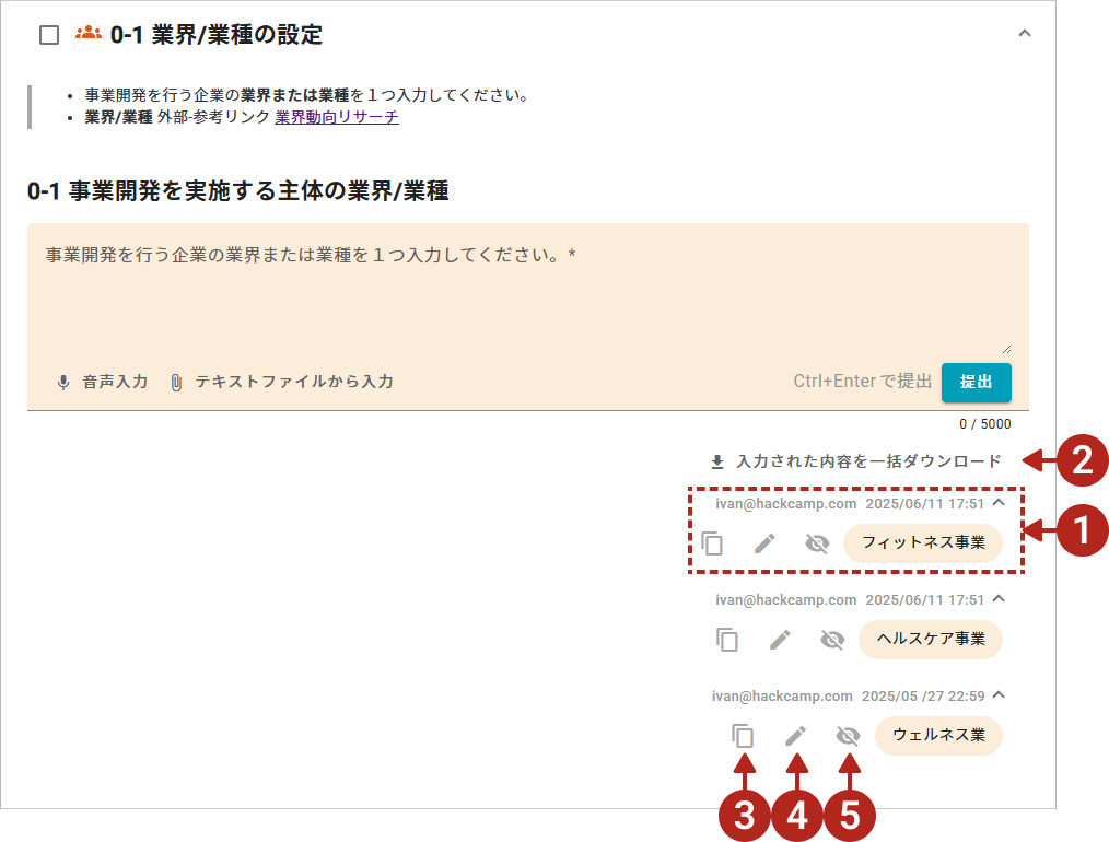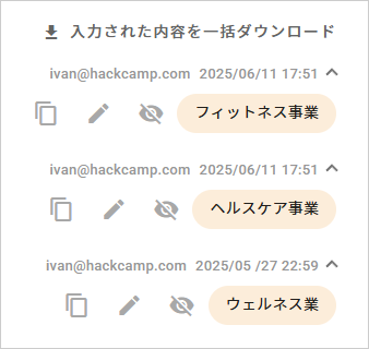 「提出」ボタンをクリックするごとに、①のブロックが上に追加されます。また、入力者のIDと入力日が表示されます。 - 一括ダウンロード