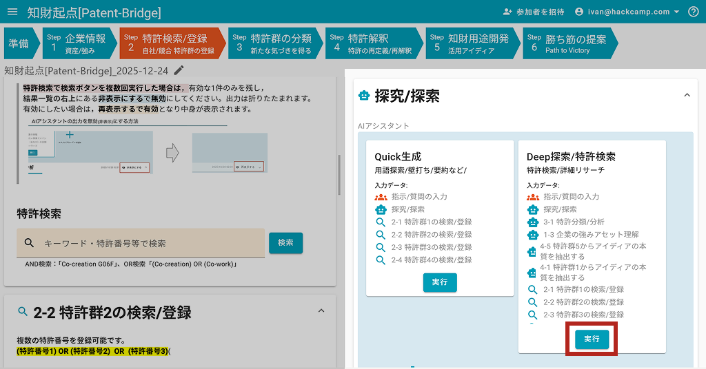 Deep探究/特許検索の「実行」ボタンをクリックします。