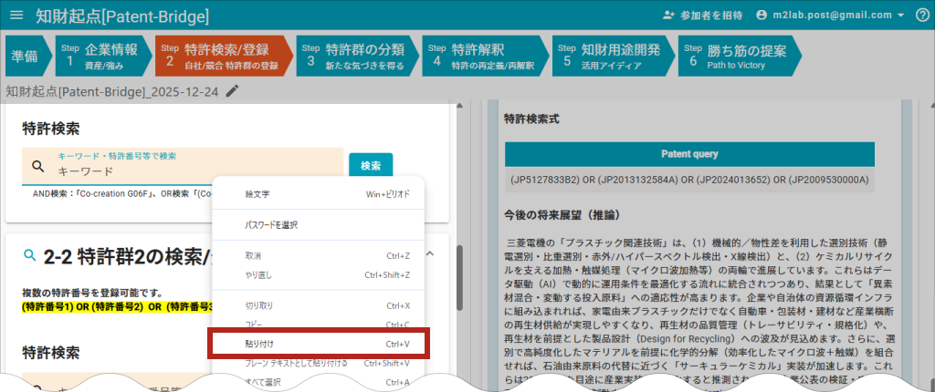 特許検索の入力エリアで右クリックし、「貼り付け」をクリックします。