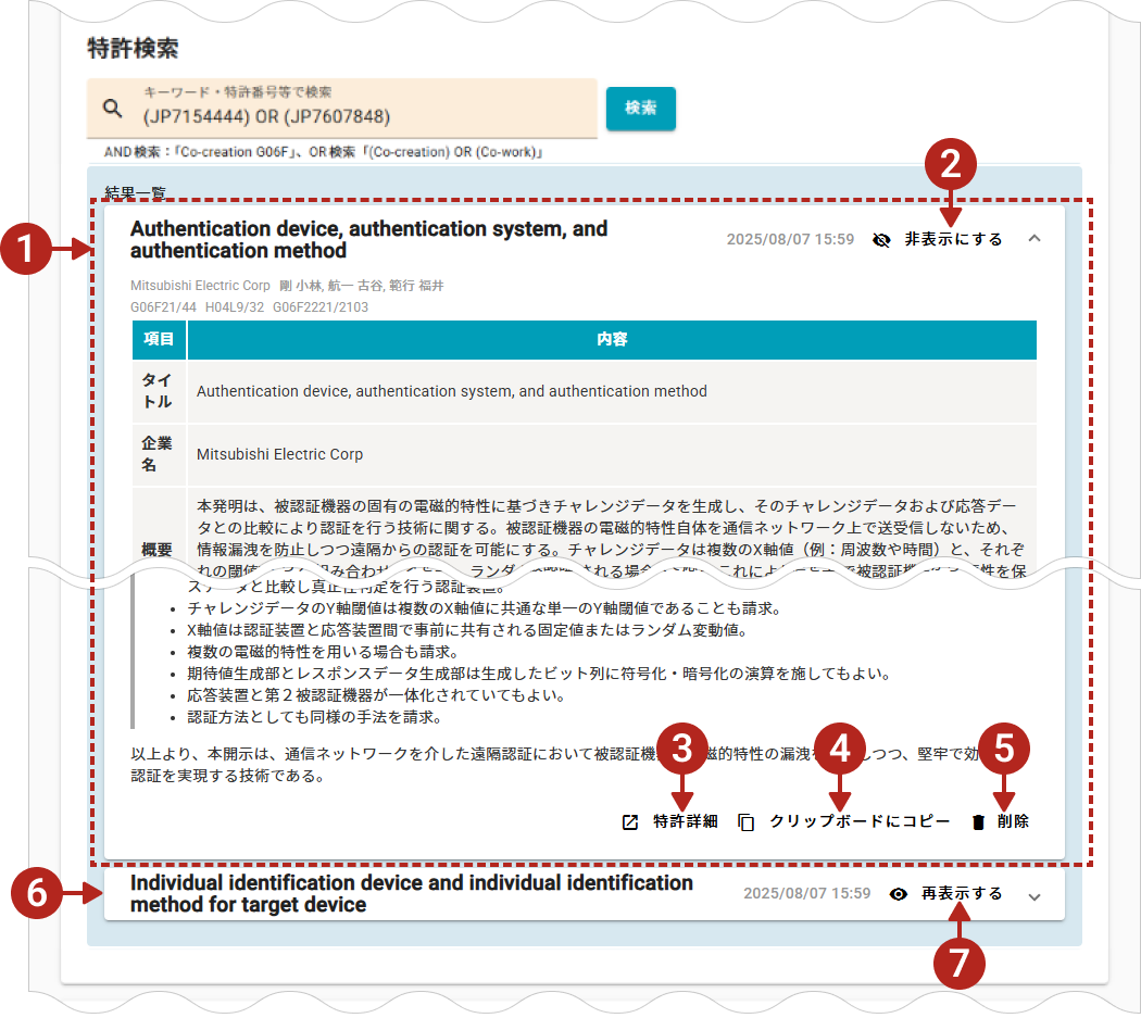 情報を表示中のカードのタイトルエリアには「非表示にする」と表示されます。 - 特許詳細
