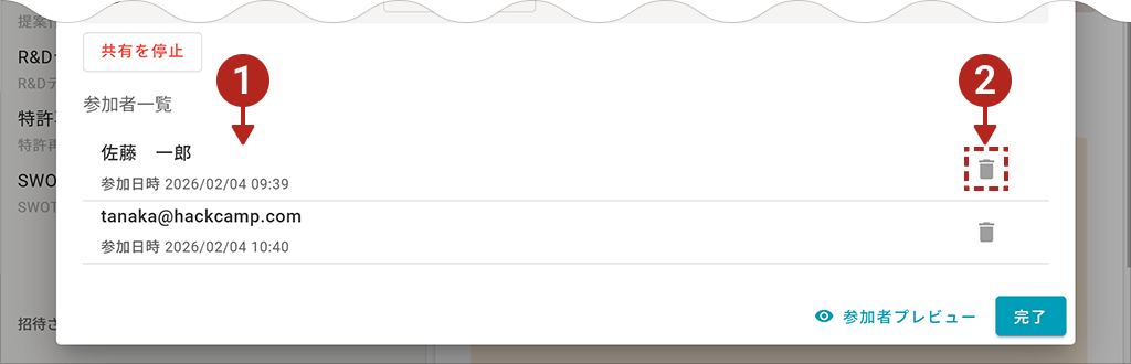 「共有を停止」ボタンをクリックすると、発行済みのすべての参加者用URLが即座に無効になり、参加者は会議を閲覧できなくなります。