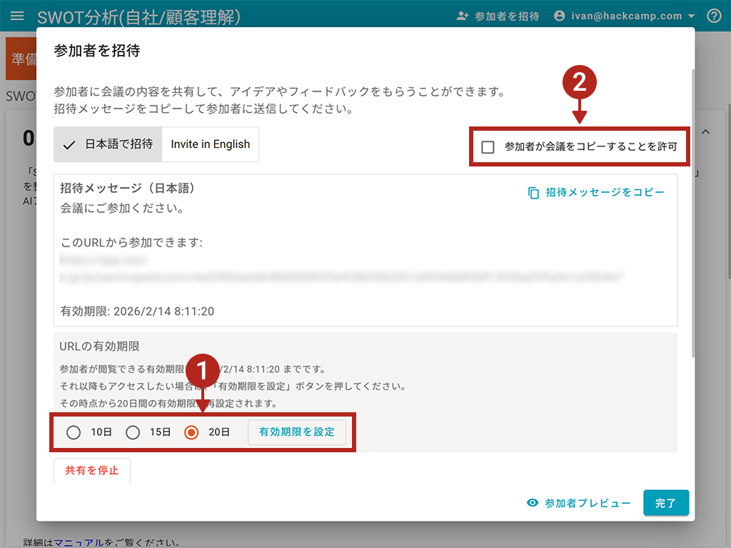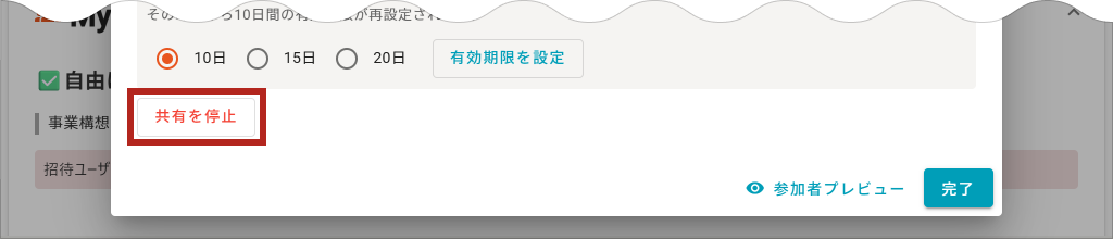 「共有を再開」ボタンをクリックすると、参加者用の新しいURLが発行され、その時点から前回設定した有効期限が再度設定されます。