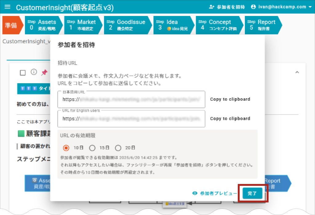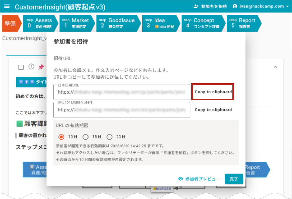 「Copy to clipboard」をクリックし、URLをコピーし、メールなどで参加者へ通知します。
