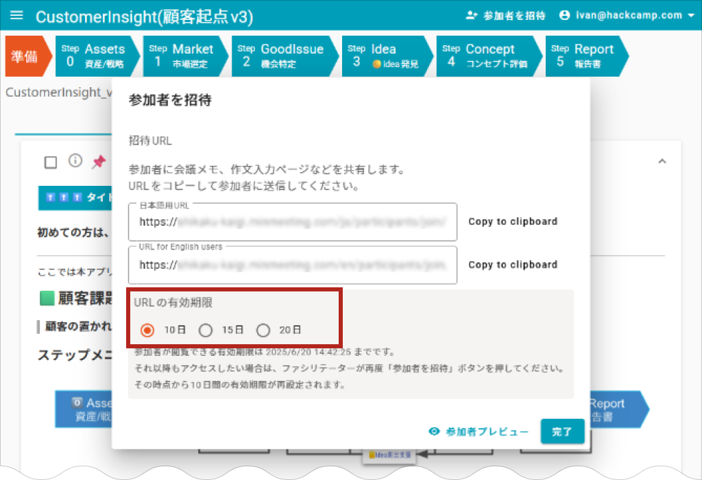 上司やメンバーからアイデアを募りたい場合は、アプリ画面の上部にある「参加者を招待」リンクをクリックします。