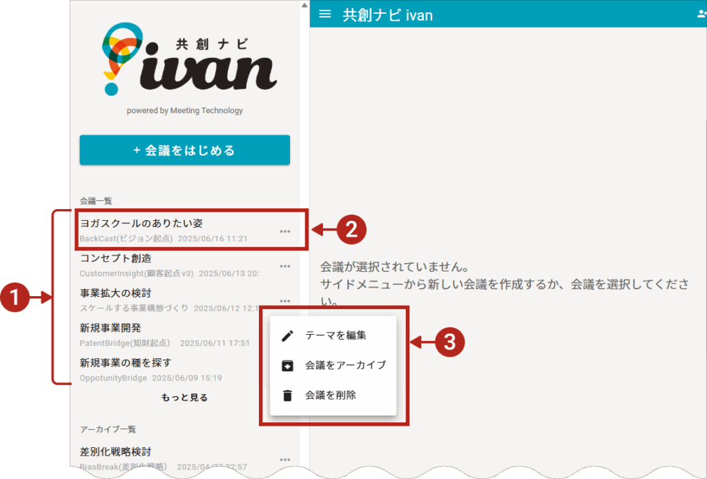 サブメニューからは、テーマの編集、会議のアーカイブと削除が行えます。