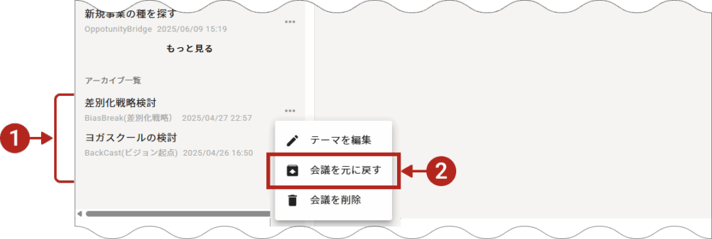 アーカイブすると、「アーカイブ一覧」に保存され、いつでも会議一覧に戻すことができます。