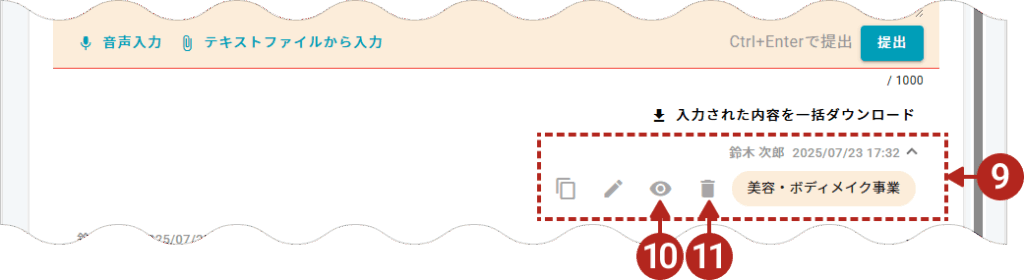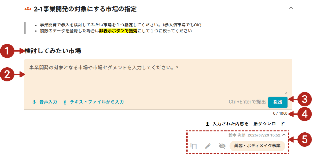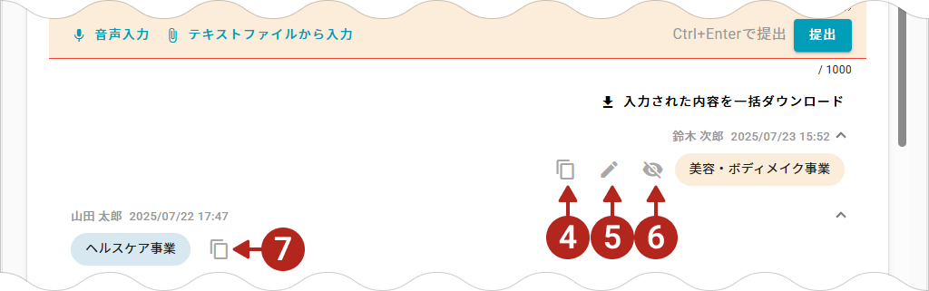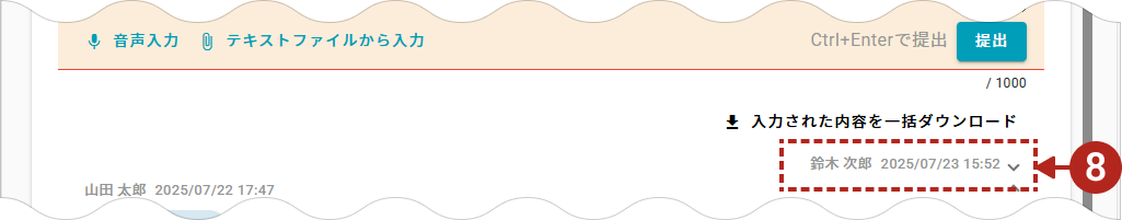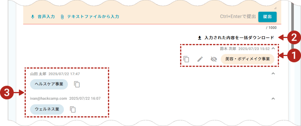 「提出」ボタンをクリックするごとに、①のブロックが上に追加されます。また、入力の名前と入力日が表示されます。 - 一括ダウンロード