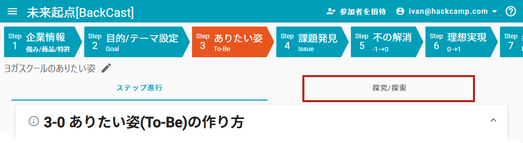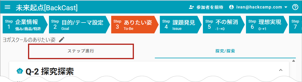 探究/探索が終わったら、サブメニューのタブから「ステップ進行」をクリックして、ステップに戻ります。