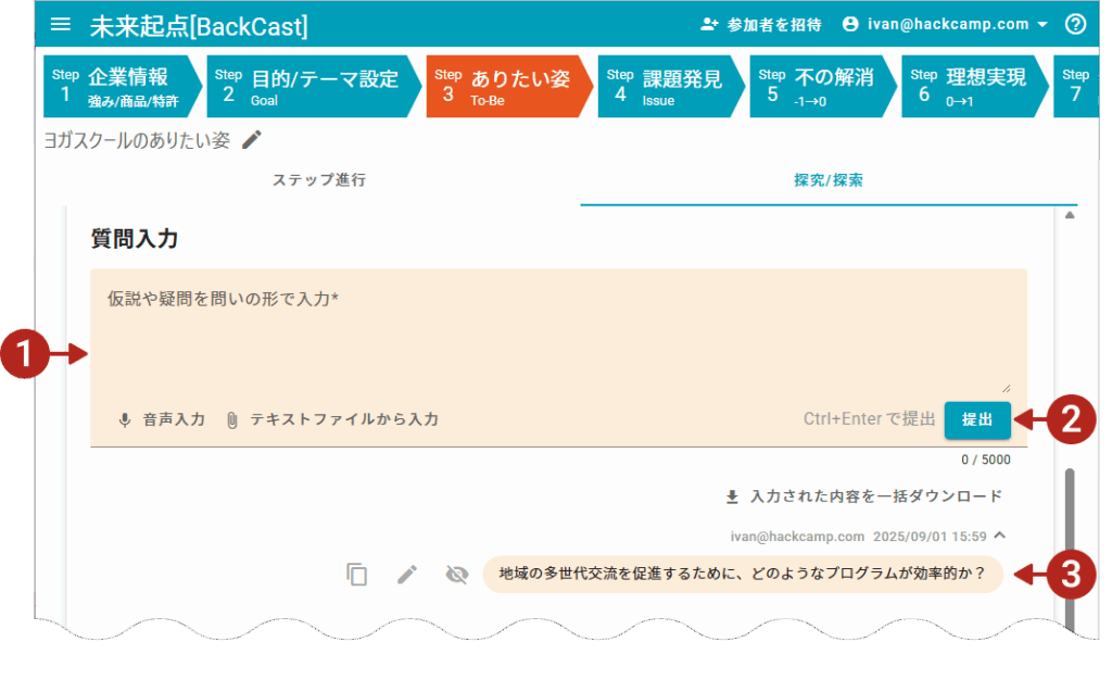 この機能では、ステップ進行とは独立してAIアシスタントへ質問を行い、情報を深掘りすることが可能です。ステップ進行と探究/探索は、必要に応じて切り替えて利用できます。