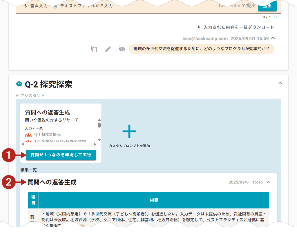 「質問が1つなのを確認して実行」ボタンをクリックすると、AIアシスタントの探究が始まります。 - 結果一覧