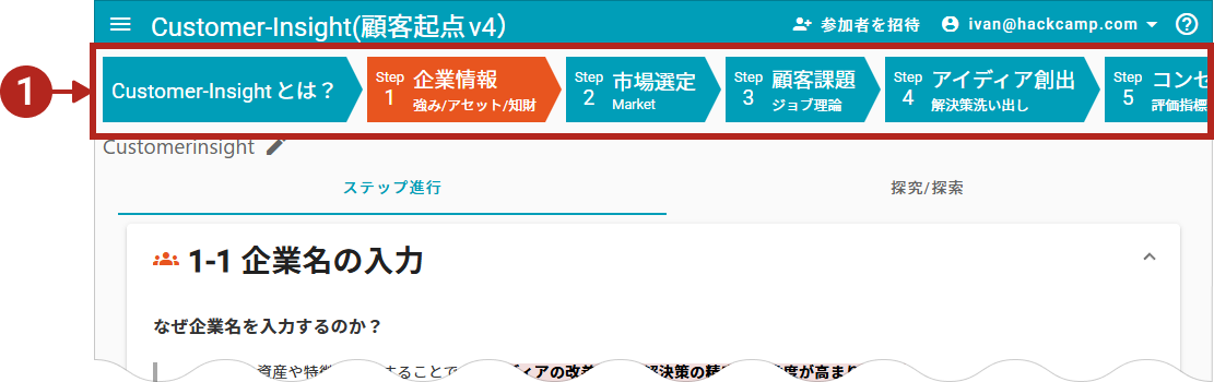参加者用の画面では、ステップボタンがありません。代わりに サブメニューがステップメニューの代替えをしています。また、ステップごとの画面構成が変わっている場合があります。