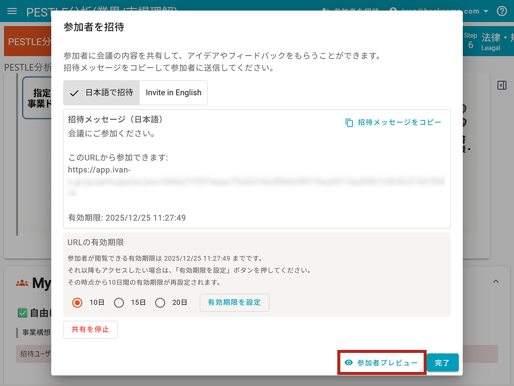 「参加者」プレビューをクリックすると、ブラウザの別タブで参加者用の画面が表示されます。