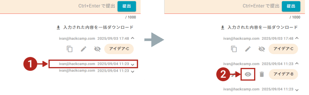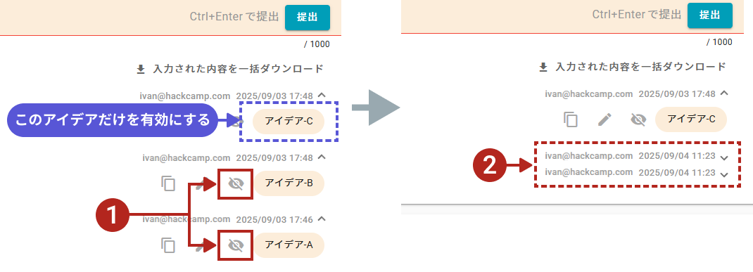 上図で「アイデア-C」だけを入力情報とする場合、①の「非表示」アイコンをクリックして「アイデア-A」と「アイデア-B」を非表示にします。非表示にしたアイデアは無効となり、AIアシスタントの生成に利用されません。 - 無効にしたアイデア