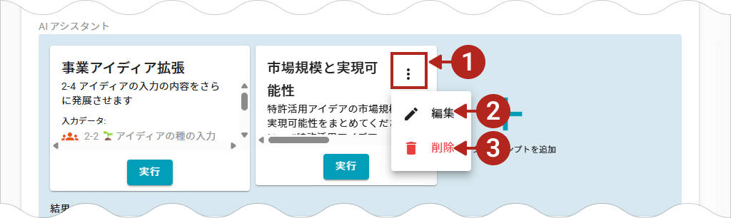 カスタムプロンプト名の右の3点ボタンをクリックすると、サブメニューが表示されます。 - 編集
