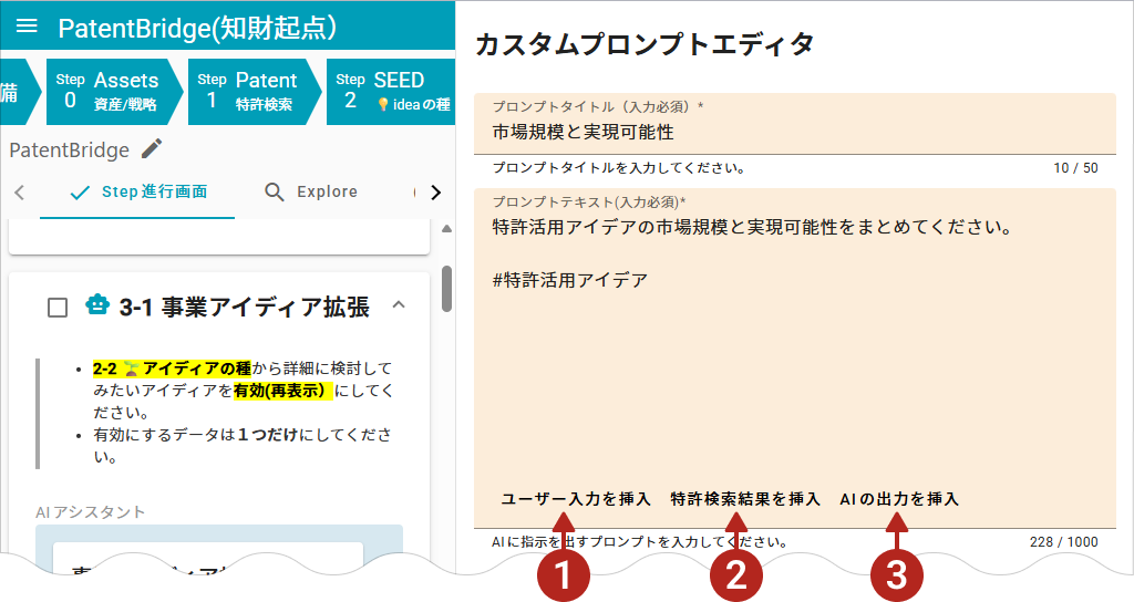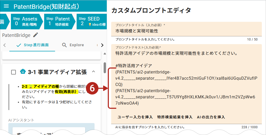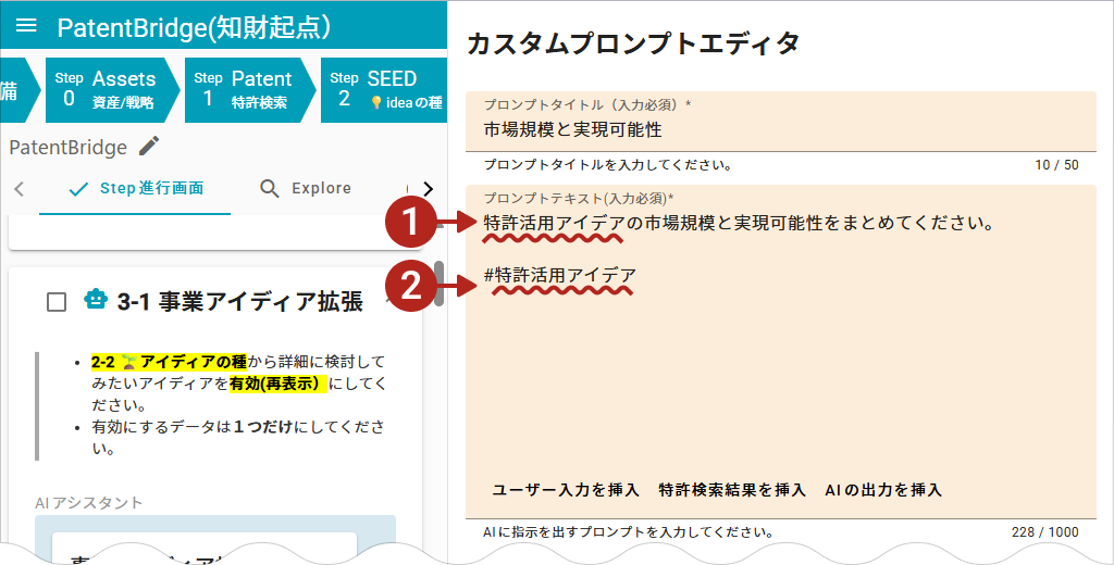 この例の場合は「特許活用アイデア」が入力情報です。 - 指示文で指定した入力情報
