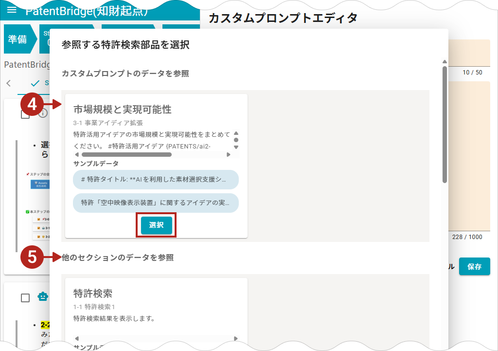入力情報として、この会議のステップ内で使われているユーザー入力、特許検索結果、AIの出力結果を引用することができます。