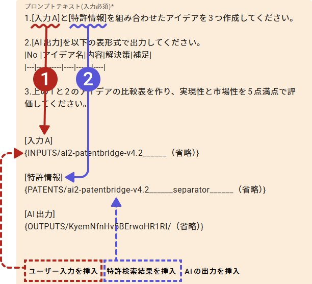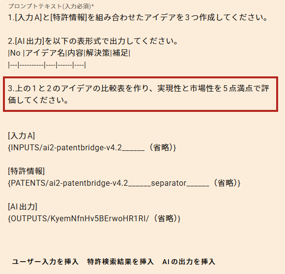 [入力A]の内容は「ユーザー入力を挿入」から選択します。 - [特許情報]を変数として指定