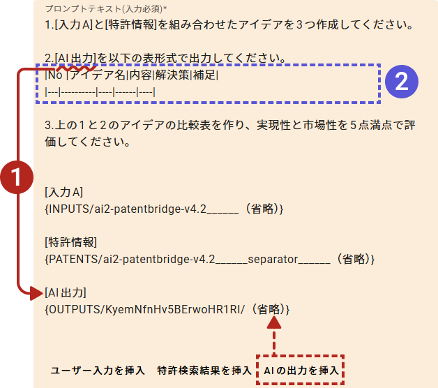 [AI出力]の内容は「AIの出力を挿入」から選択します。 - 出力形式を表に指定
