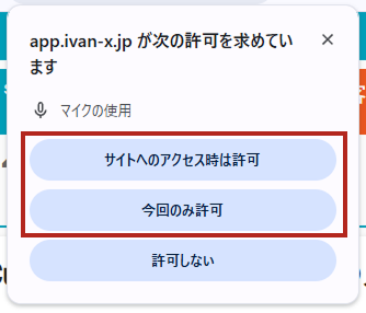 「サイトへのアクセス時は許可」または「今回のみ許可」をクリックして、マイクの使用を許可します。